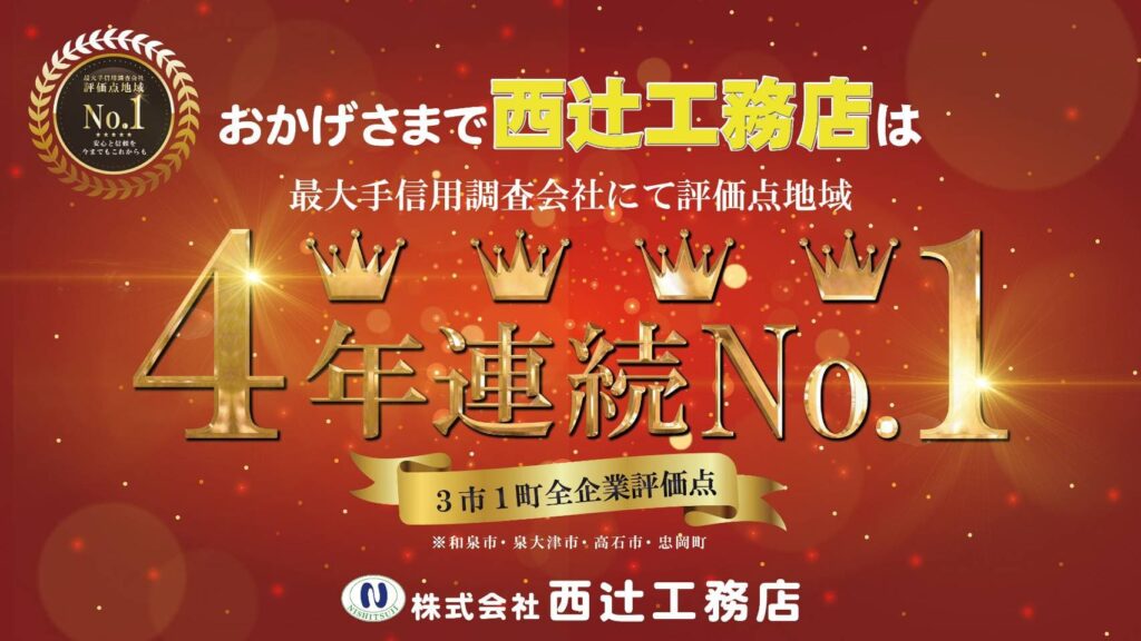 おかげさまで西辻工務店は和泉市、泉大津市、高石市、忠岡町の三市一町エリアにおいて、最大手信用調査会社から4年連続1位の評点をいただきました。これからも地域活性のために精進して参ります。